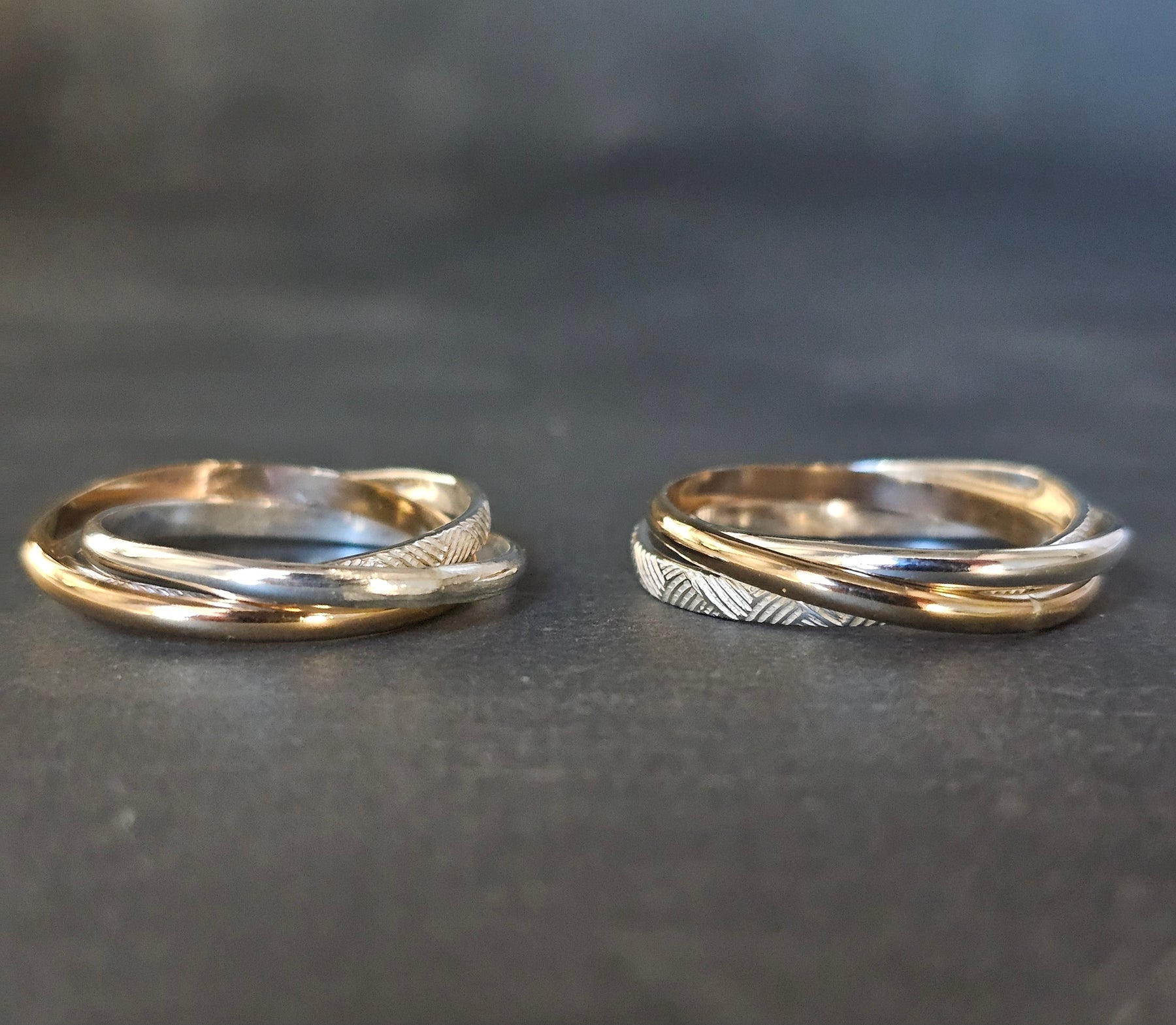One sterling silver ring, one silver patterend ring and yellow gold filled or rose gold filled. There are 3 sets of each - make a choice. No overflow on this class due to material limitations. All metal included.